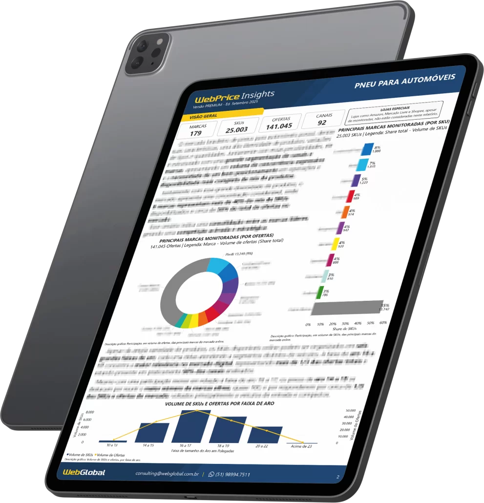 Receba um relatório pronto, elaborado por especialistas do mercado, com análises profundas sobre o segmento de PNEU PARA AUTOMÓVEIS. Identifique tendências, marcas em destaque, variações de preço, comportamento de SKUs, canais e ofertas.